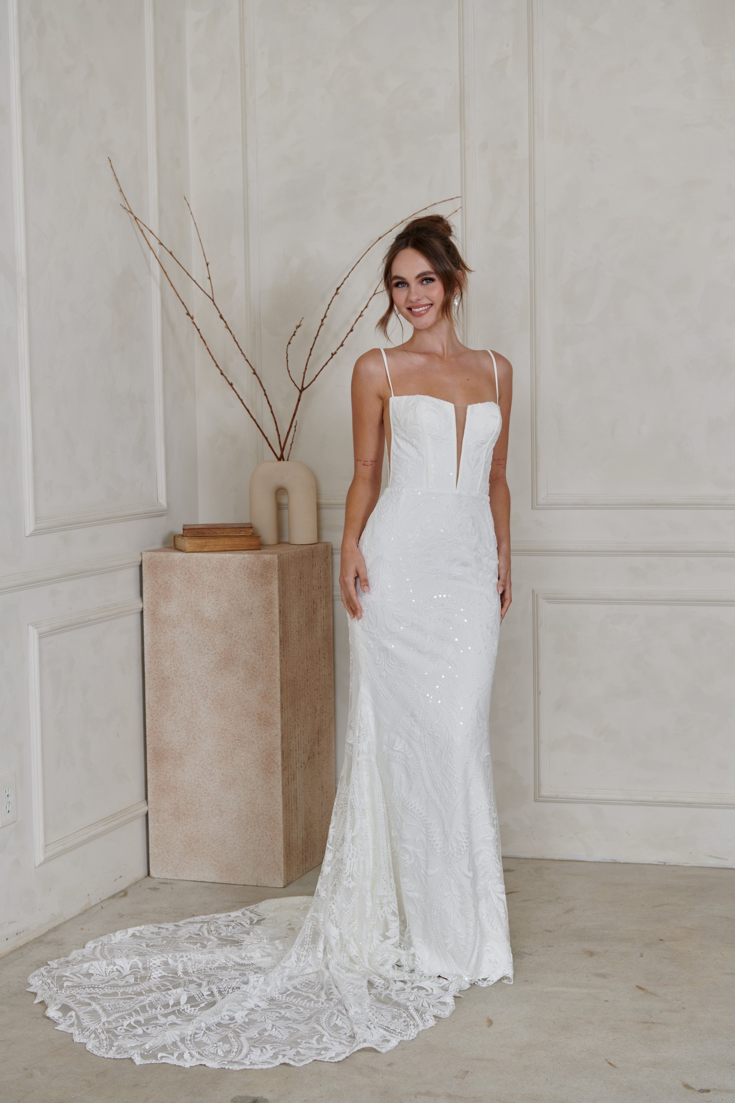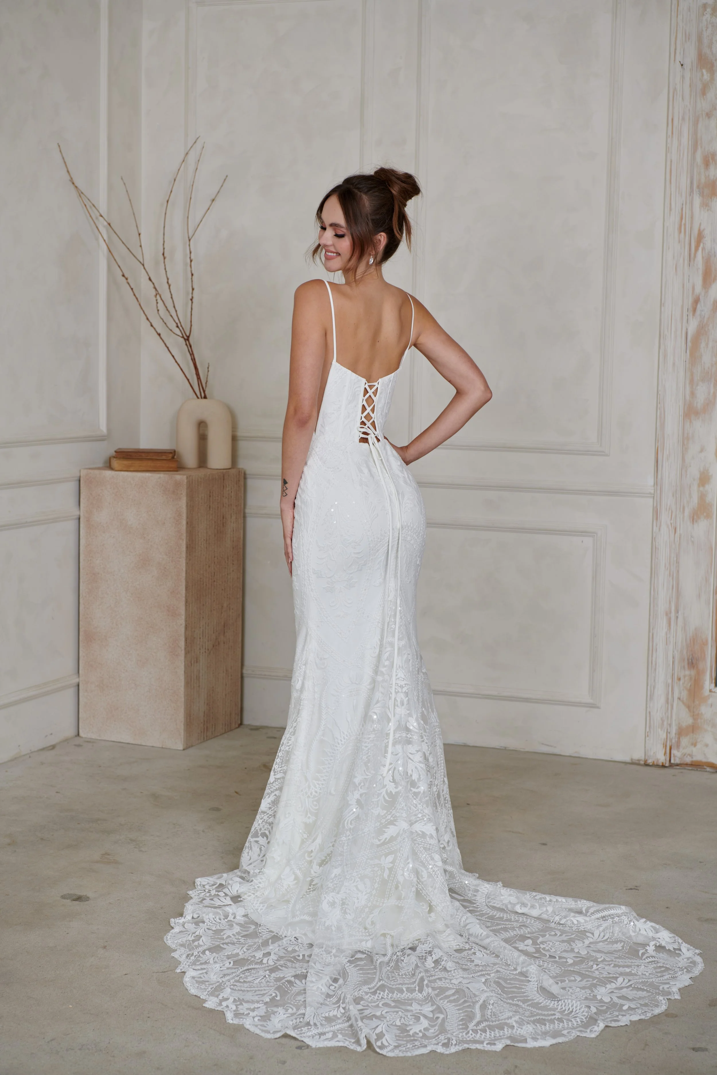 KYLE redefines modern elegance with embroidered sequin lace over smooth jersey lining. A straight neckline with plunging illusion accents and sheer side panels adds a bold, red-carpet edge, while the loop corset closure with 12-piece boning ensures a flawless fit. Delicate tulle-encased straps balance the daring details, and the fit-and-flare lace skirt creates a striking silhouette. Kyle is the perfect blend of contemporary luxury and timeless sophistication.